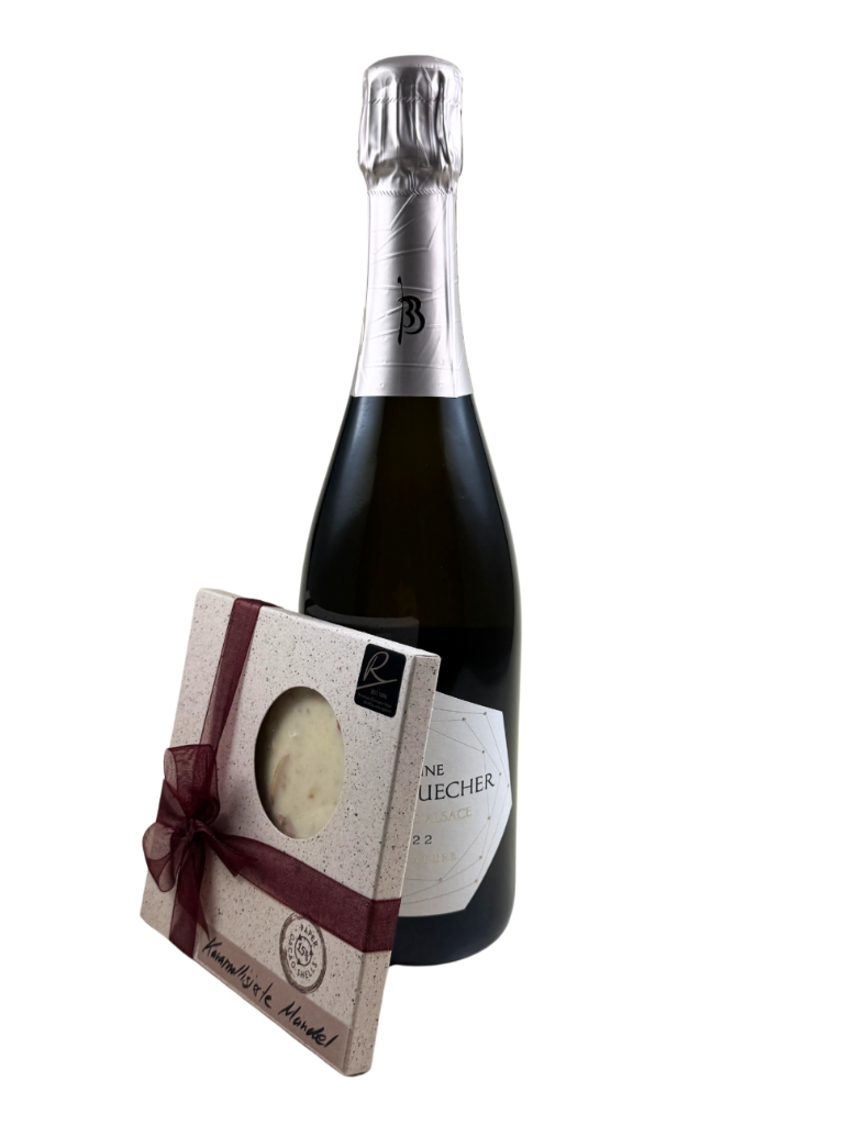 Set 8 Geschenkpakete für Weihnachten 2025- Alsaice 1 Crémant d'Alsace AOC, Brut Nature, Zero Dosage 1 Reber Tafelschokolade- Weisse Schoki + Karamellisierte Mandeln
